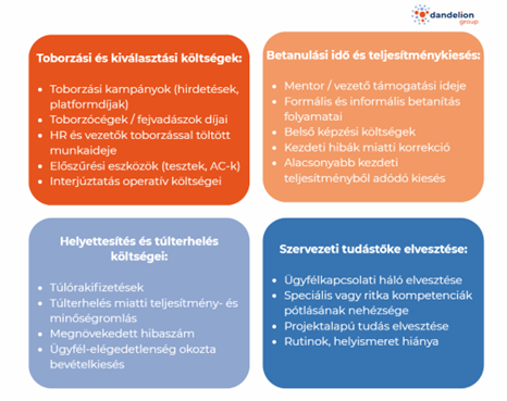 A Human Capital Accounting alapvetése, hogy a munkavállalókhoz kapcsolódó költségek és hozamok mérhetővé tehetők, és így pénzügyi értelemben is kezelhetővé válnak. Egy munkavállaló kilépése esetén több olyan költségréteg jelenik meg, amelyek a vállalat eredményességére azonnali hatást gyakorolnak. A toborzás és kiválasztás költségei: hirdetési díjak, fejvadászati költségek, HR-munkaidő, értékelő eszközök igénybevétele már önmagukban jelentősek, különösen kompetitív szektorokban. A Staffing Support Specialists kutatása szerint ezek a költségek az éves bér 50–200%-át is elérhetik. A kiválasztást követi a betanítási időszak, amely a HCA értelmezésében a termelékenységi hiátus időszaka: a frissen belépő munkavállaló teljesítménye jellemzően elmarad az optimális szinttől, miközben a mentorok és vezetők idejét is igénybe veszi. A tanulási görbe alatti termelékenységkiesés 3–12 hónapig is eltarthat, és a szakirodalom gyakran 30–70% közé teszi az ebben az időszakban bekövetkező teljesítményveszteséget.